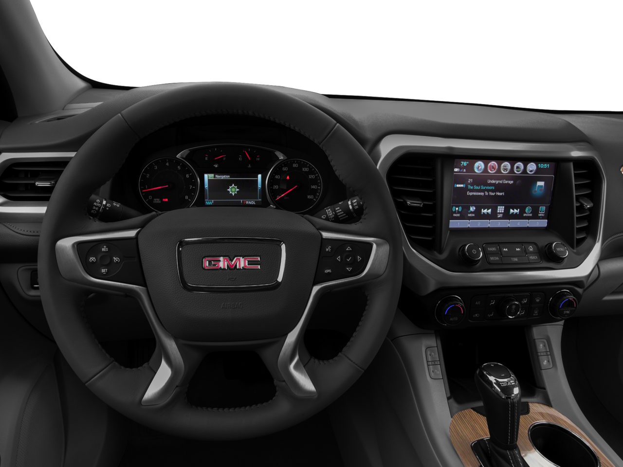 LPO, REAR SEAT DVD ENTERTAINMENT SYSTEM, ENGINE, 3.6L V6, SIDI, DOHC with Variable Valve Timing (VVT) (310 hp [231.1 kW] @ 6600 rpm, 271 lb-ft of torque @ 5000 rpm [365.9 N-m]), AUDIO SYSTEM, 8 DIAGONAL COLOR TOUCH SCREEN NAVIGATION WITH INTELLILINK, AM/FM/SIRIUSXM USB ports, auxiliary jack, Bluetooth® streaming audio for music and most phones, advanced phone integration featuring Apple CarPlay, Android Auto and voice-activated technology for radio and phone, TRANSMISSION, 6-SPEED AUTOMATIC. GMC SLT with Ebony Twilight Metallic exterior and Cocoa/ Light Ash Gray interior features a V6 Cylinder Engine with 310 HP at 6600 RPM*.