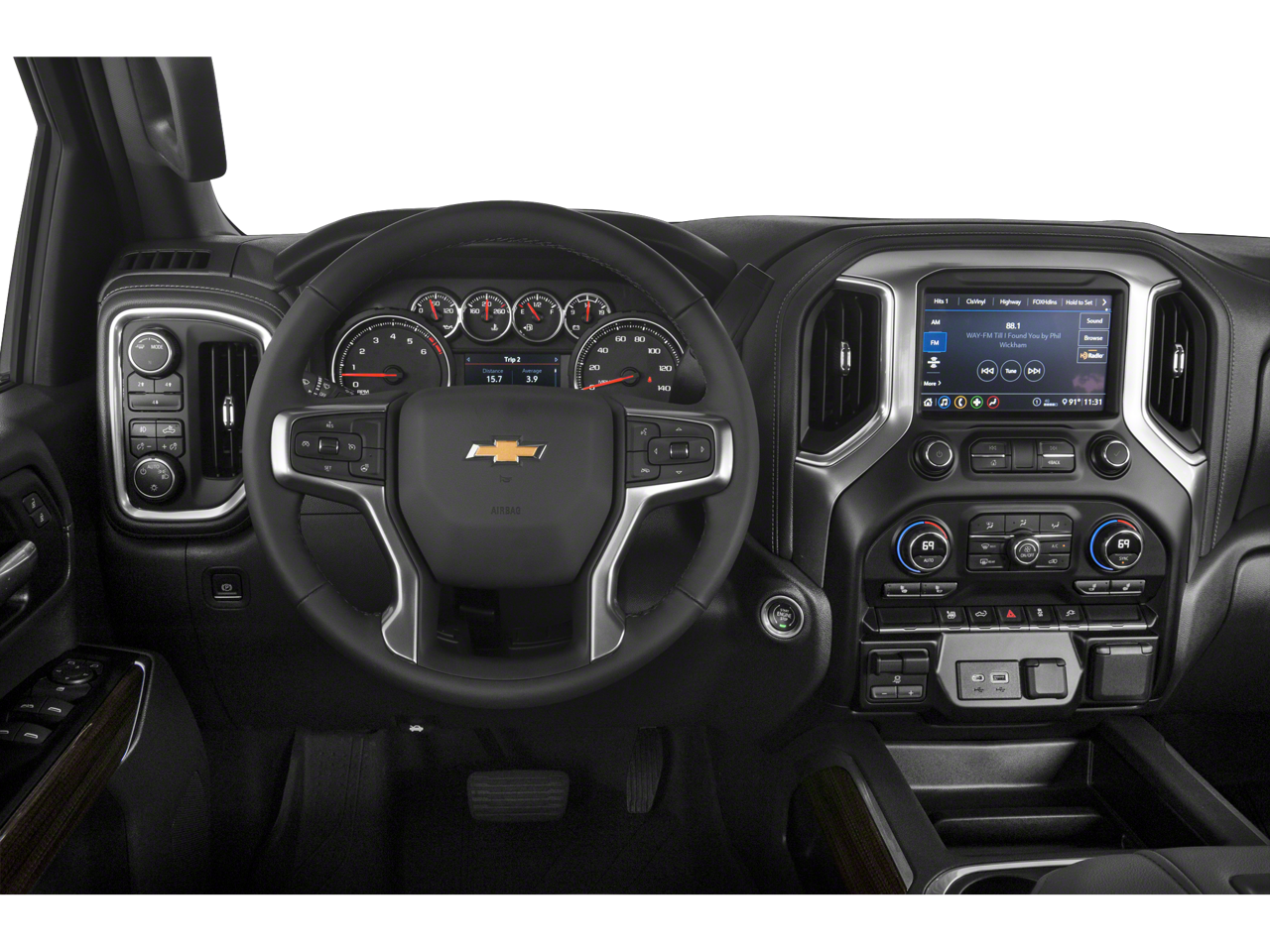 AUDIO SYSTEM, CHEVROLET INFOTAINMENT 3 SYSTEM 8 diagonal color touchscreen, AM/FM stereo. Additional features for compatible phones include: Bluetooth® audio streaming for 2 active devices, voice command pass-through to phone, wired Apple CarPlay and Android Auto capable. (STD), ENGINE, 6.6L V8 with Direct Injection and Variable Valve Timing, gasoline, (401 hp [299 kW] @ 5200 rpm, 464 lb-ft of torque [629 N-m] @ 4000 rpm) (STD), TRANSMISSION, 6-SPEED AUTOMATIC, HEAVY-DUTY (STD). Chevrolet LT with Northsky Blue Metallic exterior and Gideon/Very Dark Atmosphere interior features a 8 Cylinder Engine with 401 HP at 5200 RPM*.